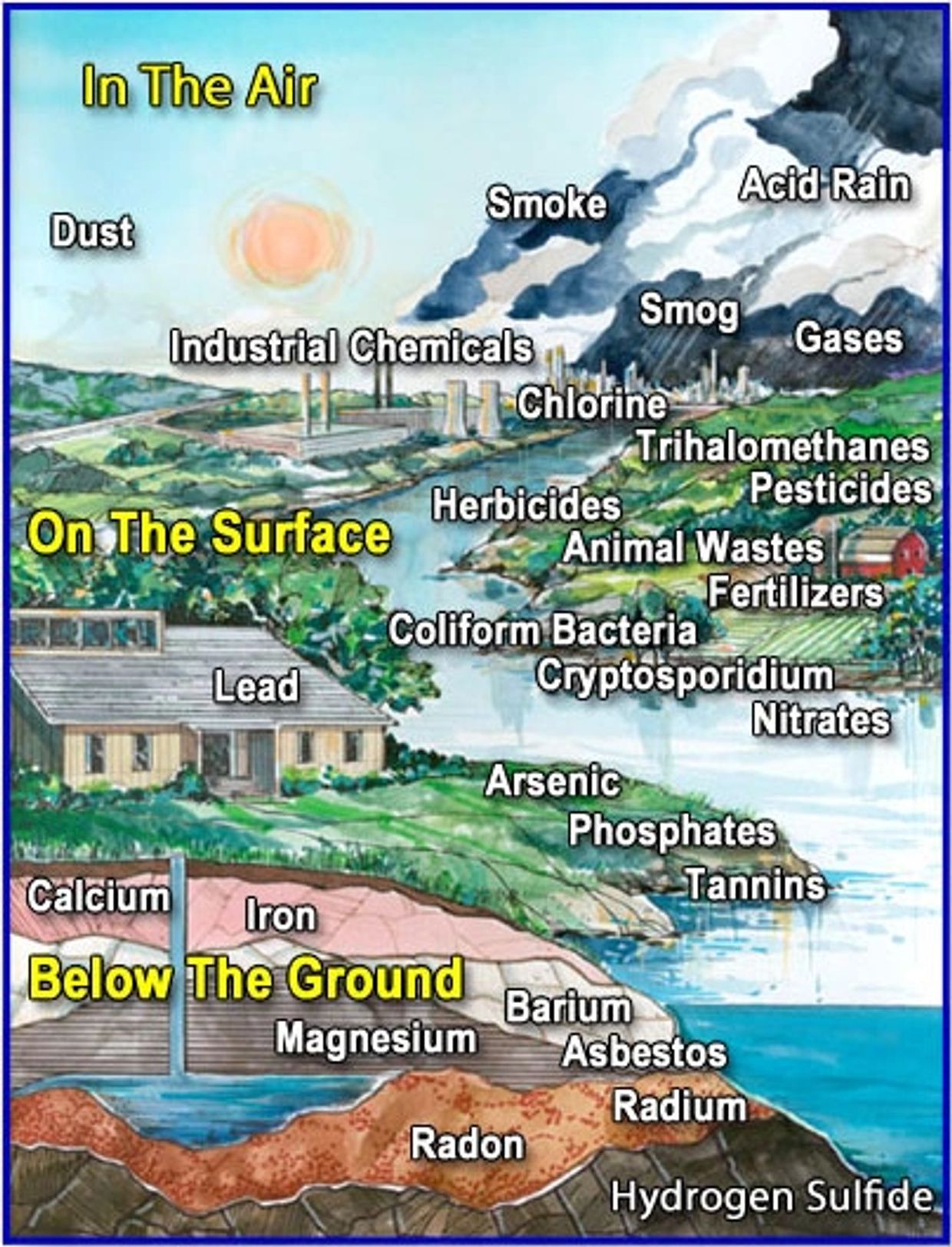 In fact, as water absorbs carbon dioxide it forms carbonic acid. As this slightly acidic water reaches the ground it picks up decayed vegetation, farm fertilizers, urban runoff, and bacteria as well as herbicides and pesticides. Then, when water percolates through the ground it dissolves calcium, magnesium, iron and metals that may be present such as lead, mercury, or cadmium. So by the time the water reaches our tap it can contain some elements that may create problems in the home.